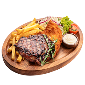 1 Viande au choix, riz, crudités, frites, sauce au choix.
