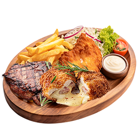 3 Viandes au choix, riz, crudités, frites, sauce au choix.