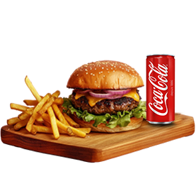 Double steaks frais smashés, galette de pommes de terre, cheddar, crudités + Frites + 1 Boisson 33cl au choix.