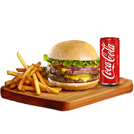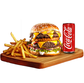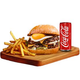 Double steaks frais, smashés, bacon de dinde, oeuf, cheddar, crudités + Frites + 1 Boisson 33cl au choix.