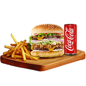 Double steaks frais smashés, tenders de poulet, cheddar, crudités + Frites + 1 Boisson 33cl au choix.
